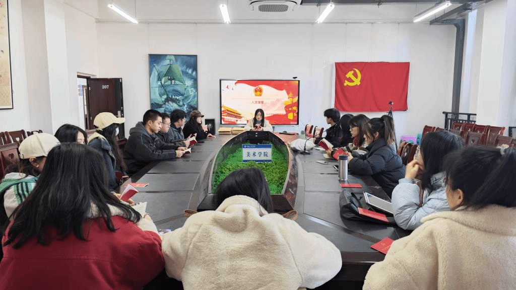 仪式有四个流程,一是全体起立,奏放《国际歌》;二是支部书记龙婷婷欢迎新党员加入党组织,并宣读新党员名单,三是由视觉传达设计专业颜诗雨同志领誓,新发展党员与与会老党员高举右拳面向党旗庄严宣誓;四是美术学专业曾宇帆同志代表新党员发言,他表示在今后的人生历程中,要努力学习、认真工作、勇于担当、甘于奉献,努力成为一名合格的共产党员,为实现中华民族伟大复兴的中国梦而不断奋斗。