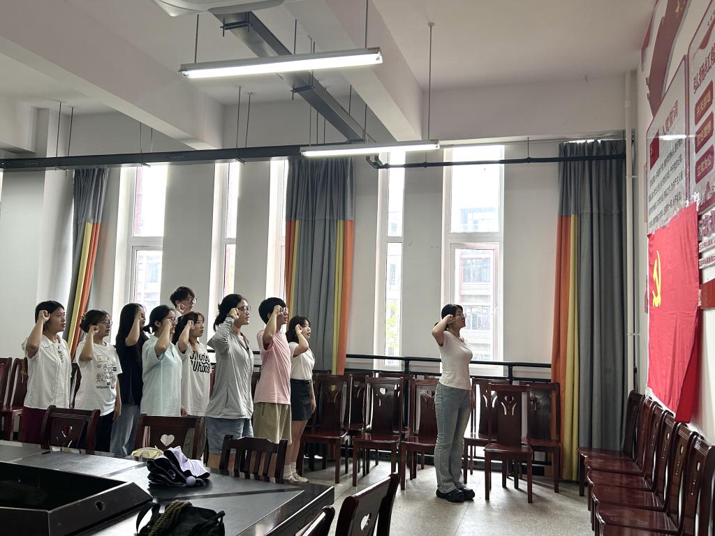在建党103周年之际,为进一步增强基层党组织的凝聚力和战斗力,激励新党员不忘初心、牢记使命,7月3日下午,金沙js5588员工第一、第二党支部组织新发展党员在博学楼5B207会议室举行入党宣誓仪式。会议由员工第二党支部书记龙婷婷主持,党总支书记田锋列席会议。