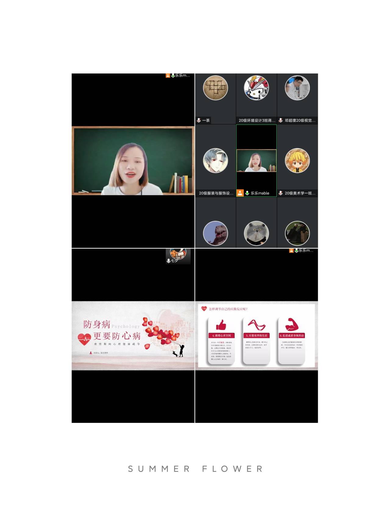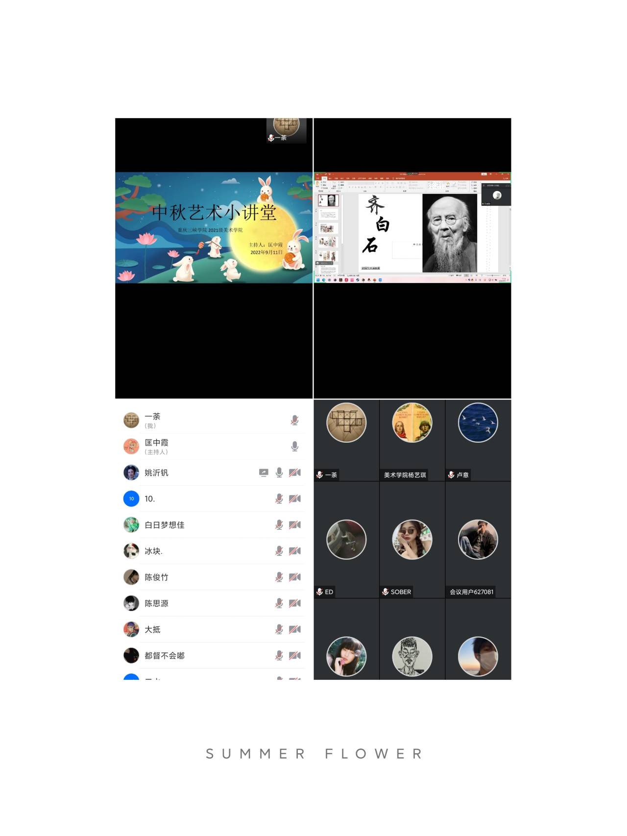 9月10日11:00,2020级辅导员张乐为学院本科生、研究生献上了《心理健康教育讲座——防身病更要防心病》讲座,主要介绍常见的负面心理应激行为、怎样调节应激反应、调控情绪方法等内容,并与员工进行交流。9月11日14:30,2019级辅导员王莉为美院师生献上了《砥砺前行 共克时艰——战疫情、灭山火、抗高温主题活动》。介绍学院马齐骏、谢江、李富源、何姿苇等暑期志愿者的活动情况,随后4位志愿者分享经历。9月11日16:00,2021级辅导员匡中霞组织师生开展《仲秋艺术小讲堂》,邀请14位同学以“艺术家故事”主题讲解,老师逐一点评。另外,9月9日—20日,学院团总支组织了“仲秋望月”线上艺术创作竞赛活动。以中秋节为主题进行书法、绘画以及废品材料工艺品等形式的艺术创作。