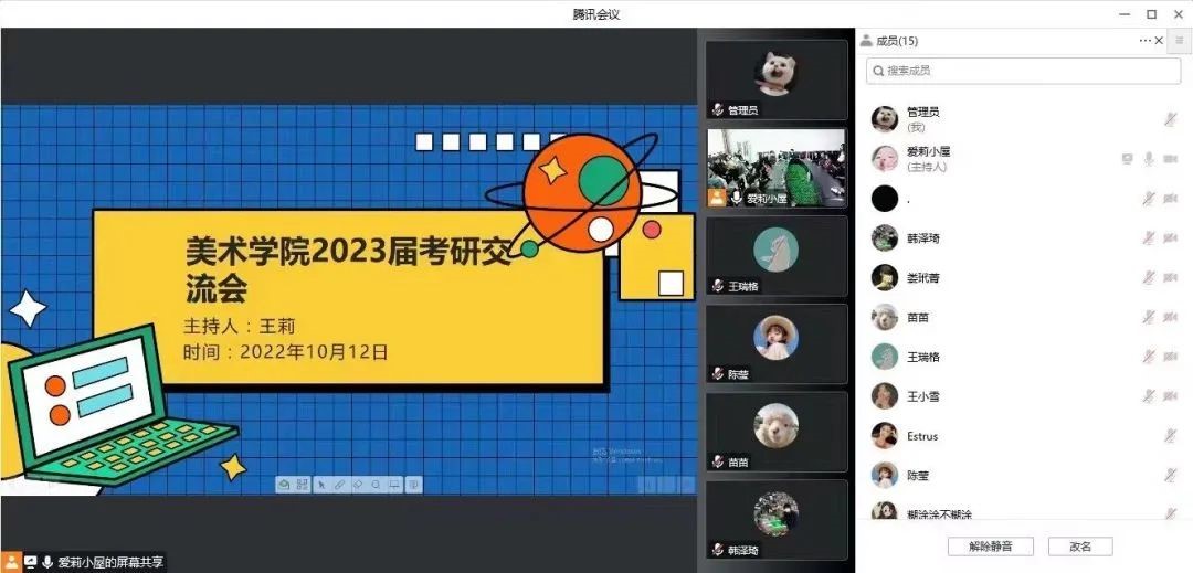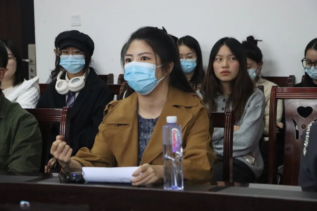 第二个环节为上岸学长学姐经验分享。八位在读研究生依次为大家分享了自己的考研经历和经验。其中考取贵州大学、陕西科技大学的22届视觉传达设计专业武叶子、黄怡卓同学分别就专业课复习的注意事项、冲刺阶段时间分配和必刷资料等做了详细的介绍;考取重庆工商大学的22届环境设计专业李思町同学从备考、英语基础巩固、科研等多方面耐心讲解;学院21级在读研究生盛悦、李基瑶、孟诗茹同学主要强调了适合自身特点复习的重要性;21级研究生陈鑫华、杜姗姗则讲述要理性选择备考院校,认真制定备考规划,以及复试调剂如何准备。