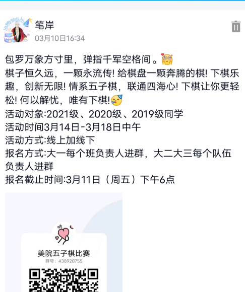 为舒缓同学们近期紧张的情绪,丰富大家的课余生活,金沙js5588团总支员工会于2022年3月14日-17日12:30-14:00组织同学们开展了线上五子棋比赛。