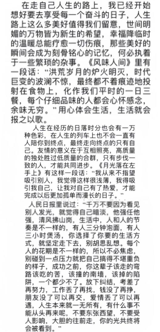 《心若向阳,何惧远方》向我们展示了从爱自己开始,在这条名为人生的道路上,迎着滂沱大雨,纵使淋的浑身湿透,也不能畏惧艰辛。世间荒凉,一定要成为自己的太阳!《往前走,向前看》向我们讲述不内耗,不焦虑,保持积极的心态,自持热爱的生活,在大学这个大家庭中也能收获快乐,保持自我的目标。